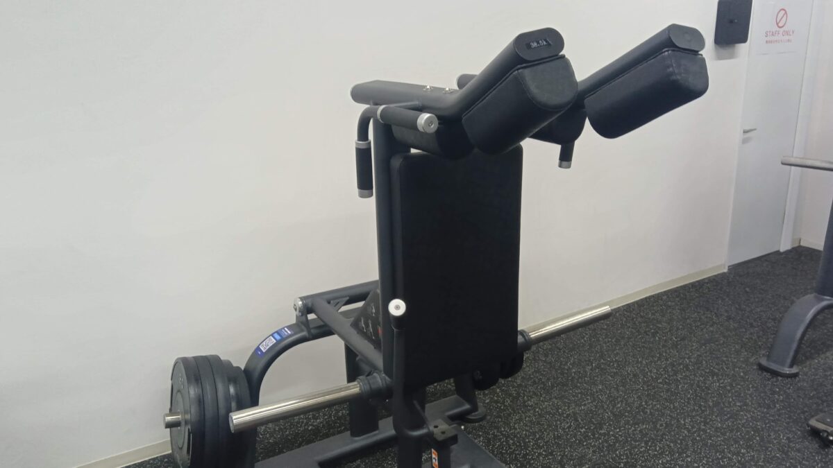 プレート式のレッグプレスはありませんが、その代わりにハックスクワットを設置。ハンマーストレングスやテクノジムのマシンにもあるマシンですが肩当てパッドが前後二段になっており、リバースポジションでも無理なくしゃがみ込めます。(他社のものはリバースで使うと顔が背もたれに当たって息苦しい。他社のものにくらべ可動域が広く、膝関節の屈曲進展にかなり効果的な設計です。