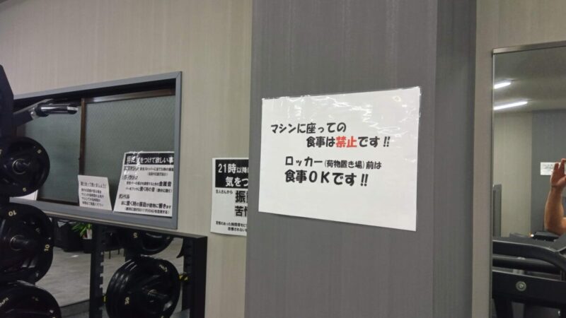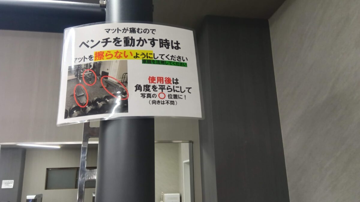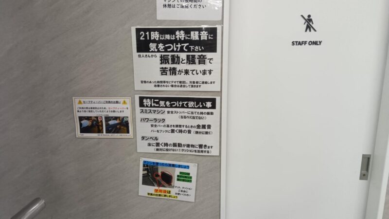 注意喚起のポップ。マナー良く利用したいですね。音に関する注意、これ立地考えたらそりゃそうだろうという。従業員さんの苦労がしのばれます。つかバーベルダンベル投げるな