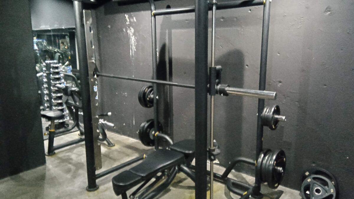 1つは垂直軌道の通常型、もう1つはわずかに前傾したインクライン型です。いずれも動作は安定しており、シャフトはやや重め。共通して「しっかり負荷が乗るスミス」という印象です。