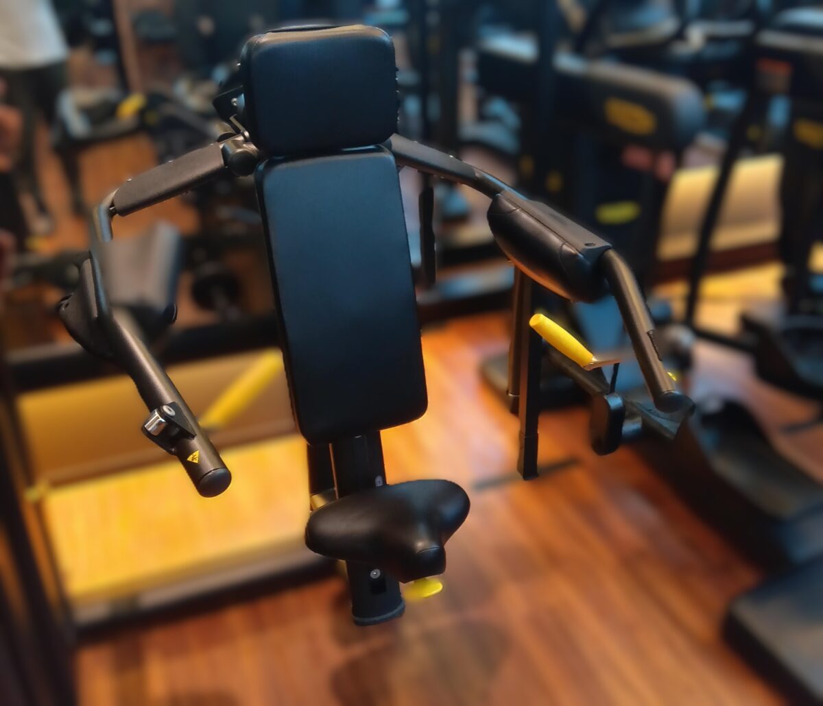 テクノジムのデルツマシン(サイドレイズ系)のウェイトスタック機です。背中を背板に付けて座り、左右のアームを挙上して三角筋に刺激を入れます。ダンベルのサイドレイズだと重量が伸びにくいところ、マシンは荷重を上げやすいので、肩のトレーニングでこういう機種があるのはありがたいです。